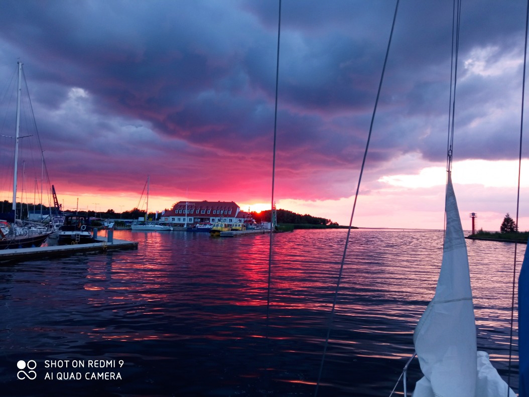 Aber schließlich erreichen wir den Dammschen See bei wieder sehr malerischer Abendstimmung und Postkarten-Horizont und fahren nach 21h im Yachthafen von Lubcyna ein, wo wir auch bald einen