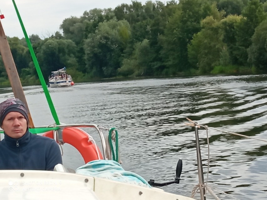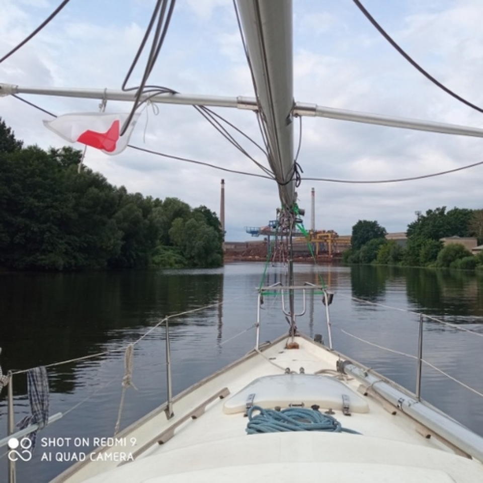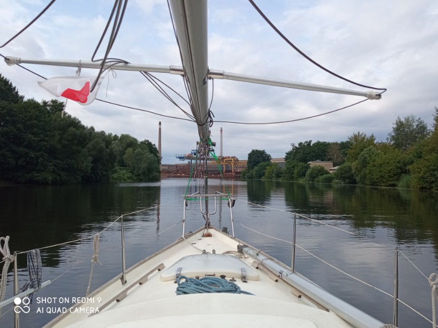 Der Motor ist mal wieder der Killer. Nachdem wir mit dem Hafenmeister im AZS ziemlich entspannt den Mast gelegt haben, fahren wir gegen 10h die Oder hoch, Richtung deutsche Grenze. Leider, nach nur wenigen km passiert es, ach!… der Bolzen löst sich wieder aus der Wasserpumpe, der Wasserasammler schmort und qualmt vor sich hin und wir müssen ein deutsches Segelboot, das