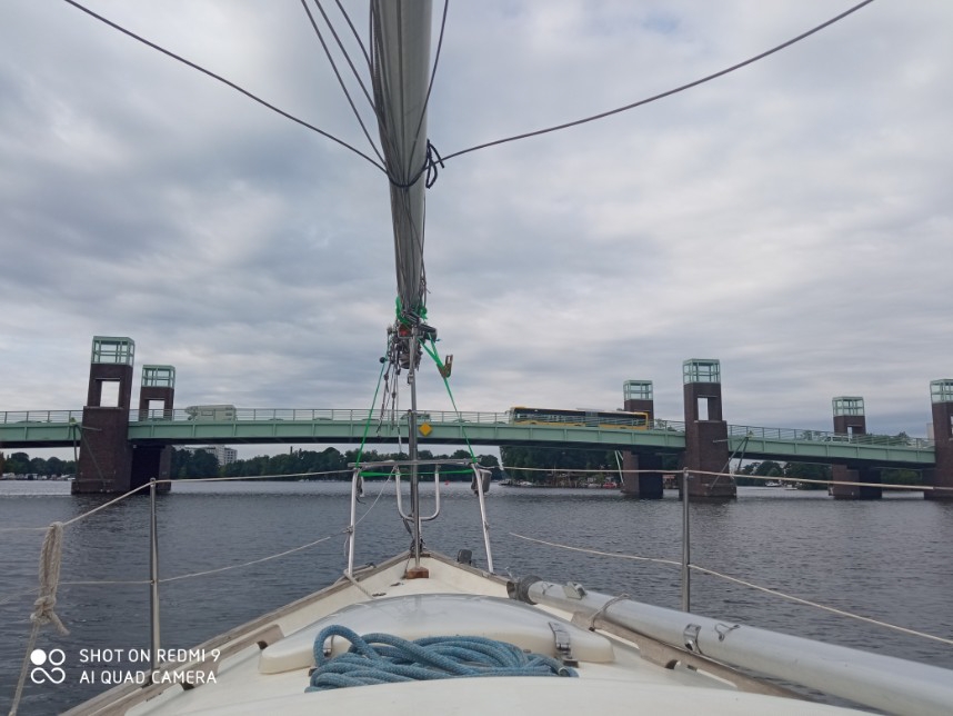 passierenden Booten werden wir mit dem Kiel auf die Steine gedrückt. Bitte lieber Kiel, du musstest viel aushalten auf dieser Reise, hoffentlich ist das nicht zu viel für dich. Die Ostsee durchfahren, auf manche Sandbank aufgelaufen, um Haaresbreite an vielen Hindernissen vorbei, um nun an einer hinfälligen Spundwand unter der A11 zu zerschellen. Nein, der Kiel ist total stabil, hält wirklich viel aus. Die Spundwand hat noch nicht mal richtige Festmacher, nur notdürftig hängen wir mit unseren Seilen an der Stahlkante, kaum durch Fenderbojen geschützt.