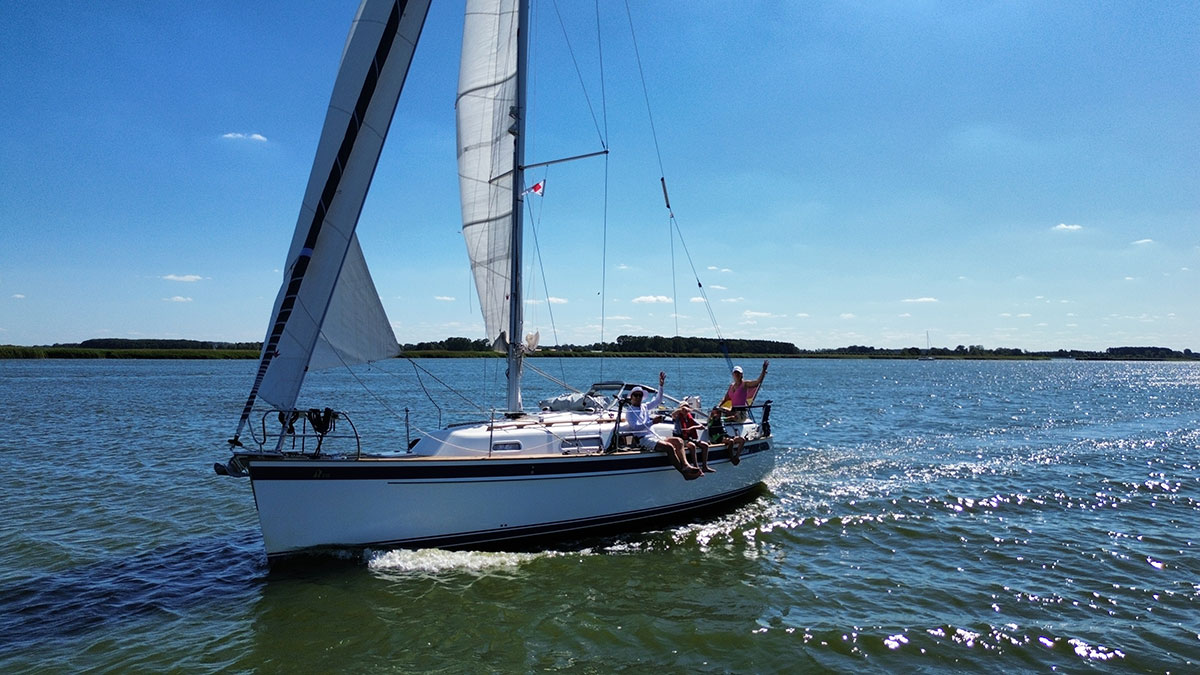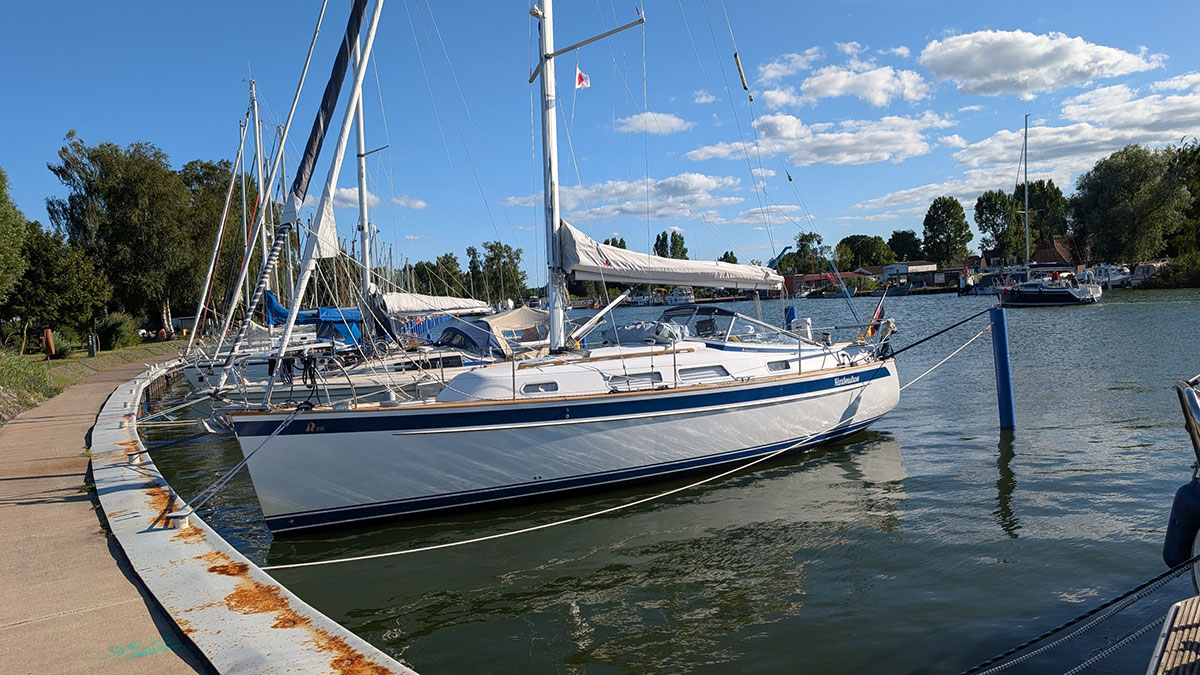 Mittags erreichten wir schließlich das Stettiner Haff, und ich setzte erneut die Segel. Als Belohnung hatten wir eine herrliche Fahrt mit Großsegel und Code Zero bis nach Mönkebude bei 9-11 Knoten Wind und purem Sonnenschein. Unterwegs trafen wir – wie schon im letzten Jahr – unser Schwesterschiff, die SY-Pollux vom SV03 am Wannsee. Wir winkten uns an Steuerbord fröhlich zu.