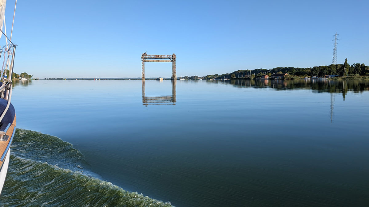 Am nächsten Morgen freuten wir uns auf das Ablegen mit dem Ziel Mönkebude. Gegen 6 Uhr legten wir bei leichtem Wind ab und überquerten den Dabie-See. Wir konnten bereits die Segel setzen, und mit leichter Unterstützung der Maschine liefen wir rund 6 Knoten.