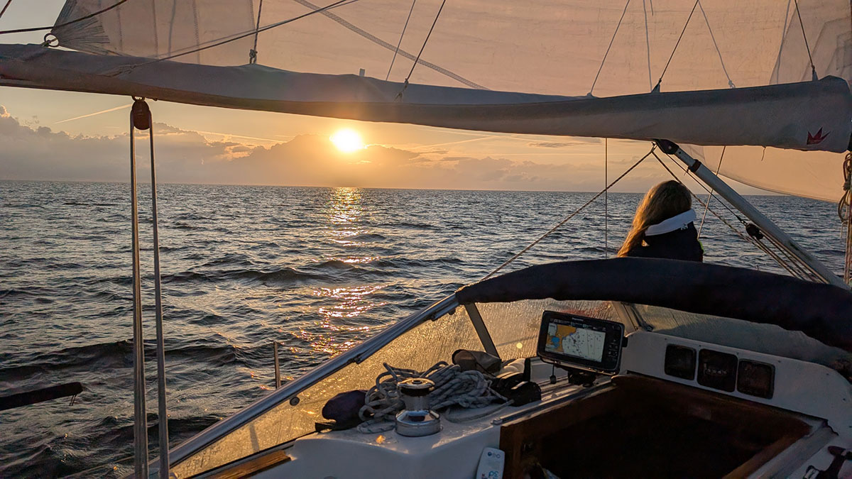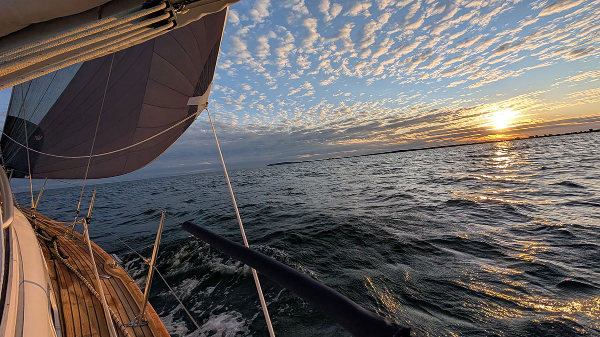 In der morgendlichen Dämmerung warfen wir die Leinen los. Die Kinder schliefen noch, und nur 30 Minuten später konnte ich bereits die Segel setzen und den Code Zero anschlagen. Eine Hanse kam ebenfalls mit uns auf Kurs, und so entstand am frühen Morgen ein kleines, freundschaftliches Rennen.