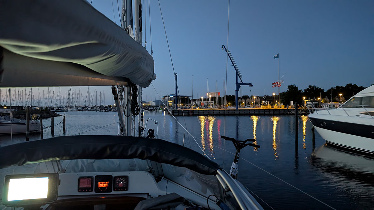 Später gab es wieder das abendliche Wetterbriefing, und wir beschlossen, am nächsten Morgen um 5:30 Uhr zu starten, um möglichst früh die Passage von Barhöft nach Falsterbo mit 65 SM zu schaffen. Der Wetterbericht passte perfekt: Windstärke 4, Nordwest, am Nachmittag auf West drehend – bei strahlendem Sonnenschein.