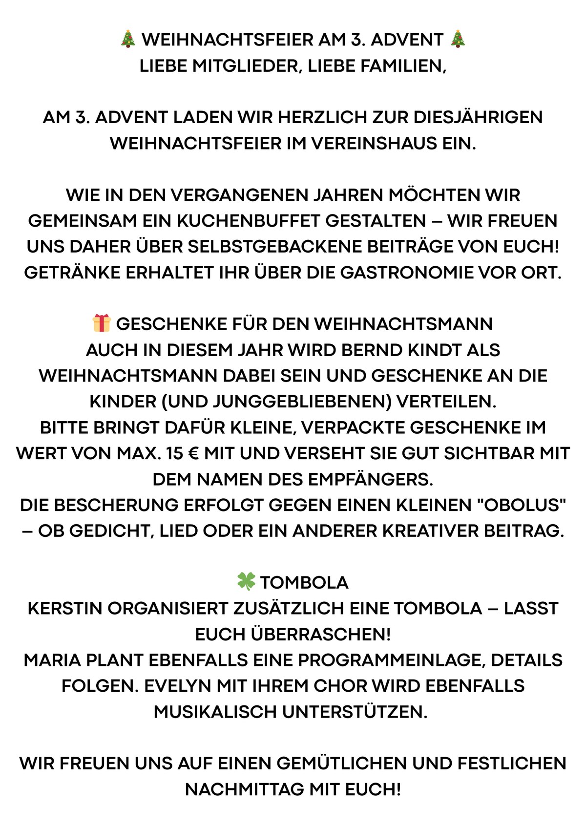 AM 3. ADVENT UM 15 UHR LADEN WIR HERZLICH ZUR DIESJÄHRIGEN WEIHNACHTSFEIER IM VEREINSHAUS EIN.